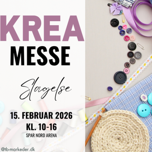 Krea-messerne i Danmark arrangeres af TB Markeder. Entré koster 50 kr. Du kan læse mere via dette link https://tb-markeder.dk/slagelse-krea-messe-15.-februar-2026 - her vil der også komme en udstillerliste.